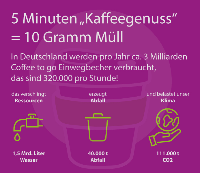 Die durchschnittliche Nutzungsdauer eines Einwegbechers liegt bei nicht einmal 8 Minuten – und so werden allein in Deutschland Jahr für Jahr mehr als 3 Milliarden Einwegbecher für Coffee-To-Go und andere Getränke verbraucht. Ob in Unternehmen, öffentlichen Einrichtungen, oder in Cafés um die Ecke: Wegwerfbecher sind einfach von gestern. Cupleys ist für uns die Vision einer echten Alternative zum Wegwerf-Wahnsinn bei Coffee-to-Go.
